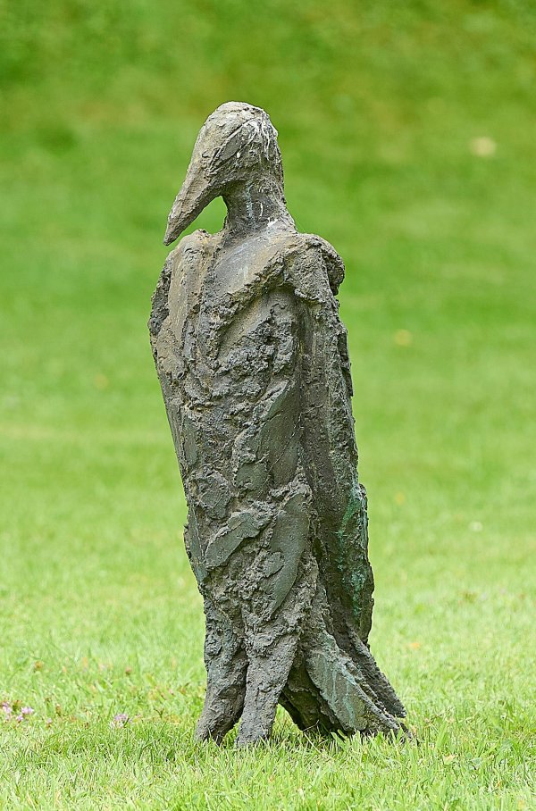 Eisenguss (oder Ferrozement), dunkelgraue Patina, um 1996. Höchst moderne Darstellung des in menschlicher Weise stolzierenden Vogels aus der Werkreihe der "Menschenvögel" zwischen Figuration und Abstraktion, welche die rohe Lebendigkeit des Modells auch im Guss umsetzt. Thomann lernte in der Kunstgewerbeschule in St. Gallen und war Meisterschüler von Mario Merz in Salzburg. H. 76,5 cm.