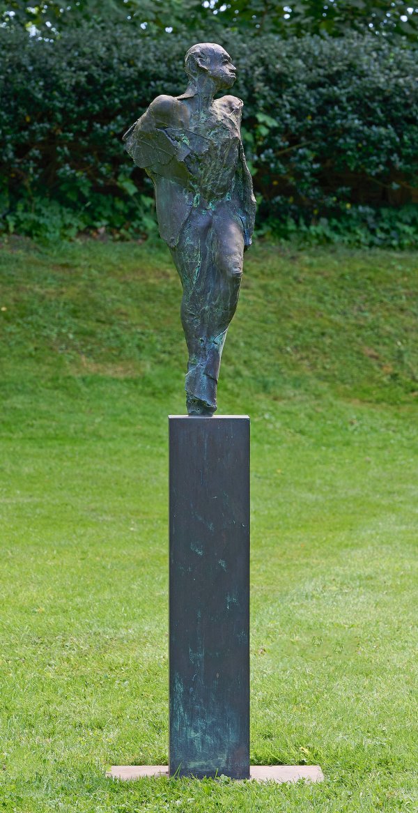 Bronze, dunkel patiniert. Expressive, zeitgenössische, in tänzerischer Weise bewegte Darstellung, bei der die menschliche Figur ganz dem unmittelbaren Schaffensprozess des Modells entspricht und zwischen Figuration und Abstraktion oszilliert. Den dynamischen Ausdruck der Plastik betont Oswald in für ihn charakteristische Weise durch die Komposition auf einer hohen Stelle, wie auch bei einer Reihe anderer Arbeiten. Oswald absolvierte 1981-1990 ein Bildhauerstudium in Mainz bei Werner Durth, Heinz Hemrich und Peter Lörincz. Schon 1985 erhielt er für seine Arbeiten den Daniel-Henry-Kahnweiler-Preis, dem zahlreiche Auszeichnungen und Ausstellungen folgten. Außer kleineren Werken schuf er zahlreiche Arbeiten für öffentliche Räume, Plätze und Parks. Ein Schwerpunkt seines Schaffens sind Tänzer, für die er intensive Studien bei Tanzkompanien betrieb. Ges.-H. 184 cm; Plinthe 54,5 cm x 39 cm.