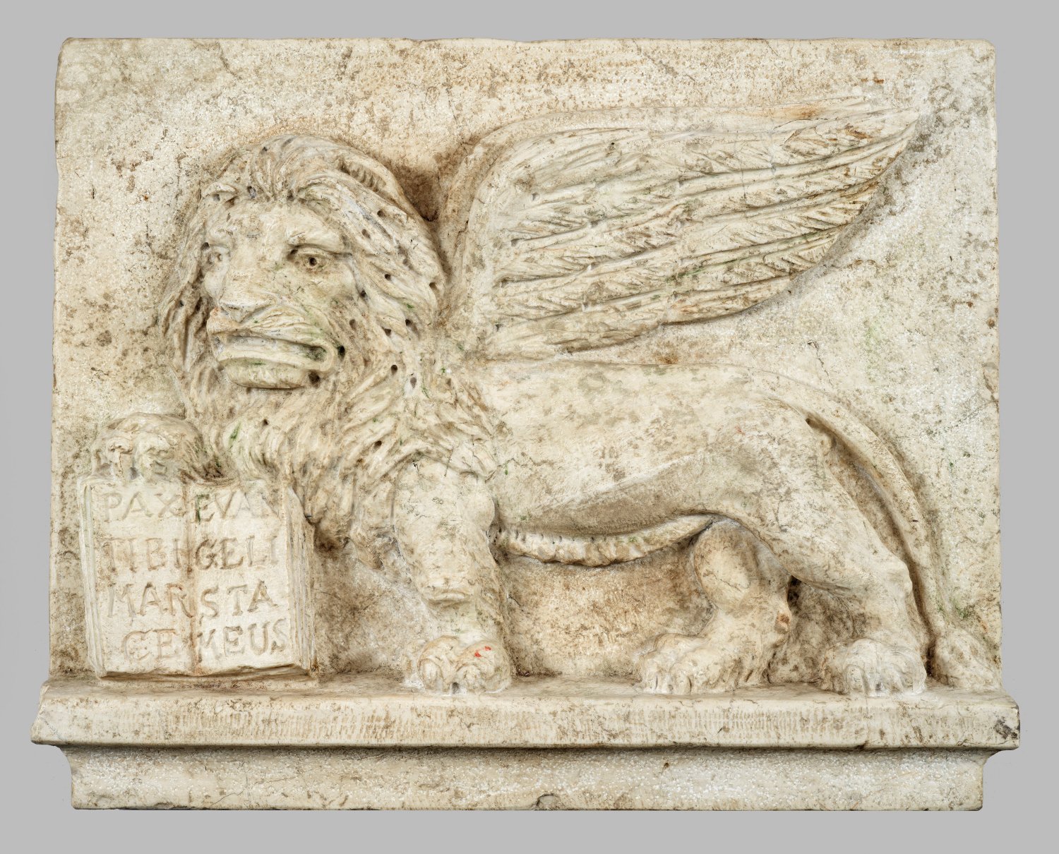 Hellgrauer bzw. chamoisfarbener Stein. Querrechteckige Platte mit Darstellung des geflügelten Markuslöwen als Symbol Venedigs mit einem aufgeschlagenen Buch und lateinischer Inschrift "PAX TIBI (,) MARCE (,) EVANGELISTA" (Friede sei mit dir, Markus, mein Evangelist). 42 cm x 52 cm.