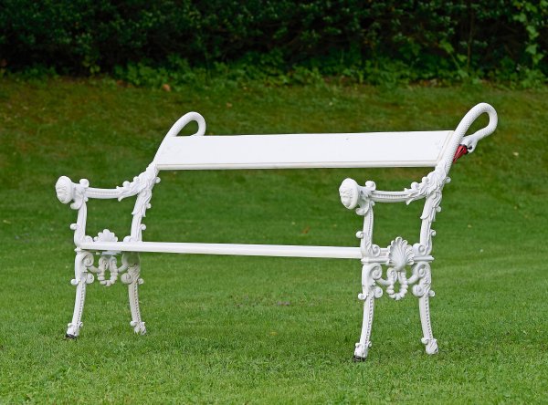 Gusseisen und Holz, weiß lackiert sowie schwarz und rot akzentuiert. Durchbrochen gearbeitete Seitenwangen, aus gegeneinander gestellten Voluten und großen Muschelmotiven. Geschweift ansteigende Armlehnen mit Maskarons, in plastisch gestaltete Schwanenhälse übergehend. Sitz- und Lehnenfläche aus breiten Stegen. H. 94 cm. 186 cm x 75 cm.
