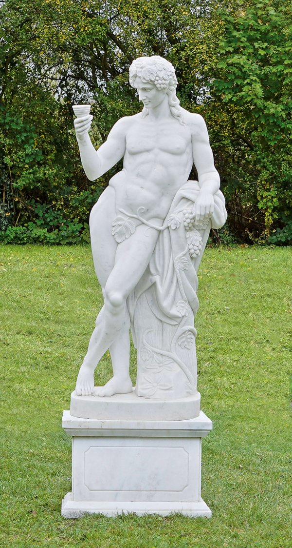 Weißer, hellgrau geäderter Marmor. Vollplastische Darstellung des Bacchus als Aktfigur eines Jünglings, der sich seitlich an einen Baumstumpf mit Weinreben und -trauben lehnt und auf eine Weinschale in seiner erhobenen rechten Hand blickt. Von antiken römischen Bacchus-Skulpturen, wie der im Prado in Madrid und im Louvre in Paris sowie dem berühmten Bacchus von Michelangelo (1496/97) inspirierte Statue. Gesonderter rechteckiger Postamentsockel. Skulpturen-H. ca. 180 cm; Sockel-H. ca. 50 cm.; Ges.-H. ca. 230 cm.