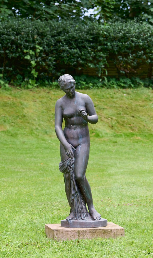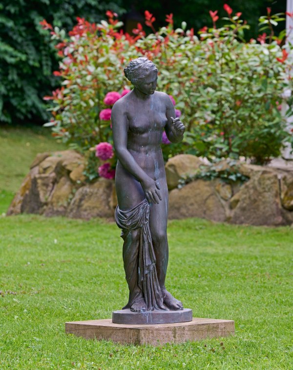 Bronze, patiniert; Runder Gießerstempel "GUSS SCHWAB Münster". Guss Ende 20. Jh.; Steinsockel. Vollplastische Darstellung der Venus in leicht gebeugter Pose auf einer runden Plinthe, zu der linken, in Brusthöhe erhobenen Hand blickend, während sie mit der rechten Hand ein Tuch festhält. Große, fein ausgeführte Bronzeplastik nach der berühmten, antiken römischen Marmorskulptur aus dem 1./2. Jh. n. Chr. im Britischen Museum in London (Inv.-Nr. 1805,0703.16). Diese römische Kopie einer griechischen hellenistischen Statue (des 4. Jhs. v. Chr.) wurde 1775 durch Gavin Hamilton in Ostia gefunden und befindet sich seit 1805 im Museum. Bronze-H. 105,5 cm; Steinsockel 9 cm x 49 cm x 49 cm.