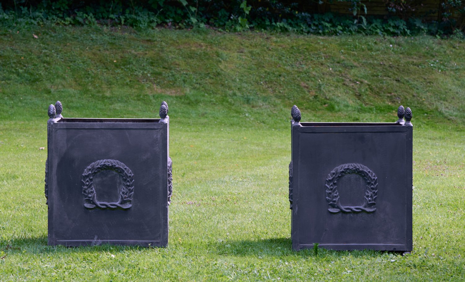 Metall und Blech, anthrazitfarben lackiert. Rechteckiger Korpus mit plastischen Zapfenbekrönungen. Allseitig erhaben reliefierte Kranzmotive. Altersspuren. H. 69,5 cm. 54 cm x 54 cm.