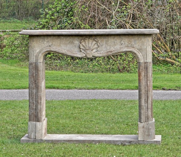 Graublau gemaserter Kalkstein, sog. Bluestone. Über rechteckiger Sockelplatte bombierte Podeste. Oberhalb an den Ecken gerundeter Korpus mit flach reliefierten Reserven. Profilierte Rahmung mit geschweiftem oberen Abschluss und zentralem, plastisch gestalteten Muschelmotiv. Geschweifte Deckplatte. H. 122 cm. 180 cm x 40 cm.