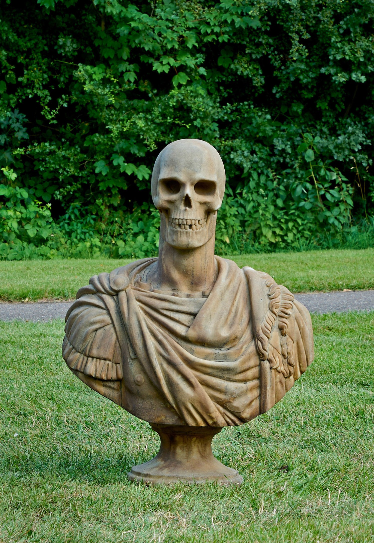 Weißer, hellgrau geäderter Marmor. Vollplastische Darstellung in der Tradition italienischer Renaissance- und Barock-Büsten mit Vanitas-Motiven sowie antiker römischer Feldherren- und Imperatorenporträts. Auf eine Säulenplinthe komponierte Büste mit Brustharnisch und umgelegtem Mantel im altrömischen Stil, der teilw. bereits zu einem Totenschädel skelettierte Kopf mit lachend geöffnetem Mund. H. 74 cm.