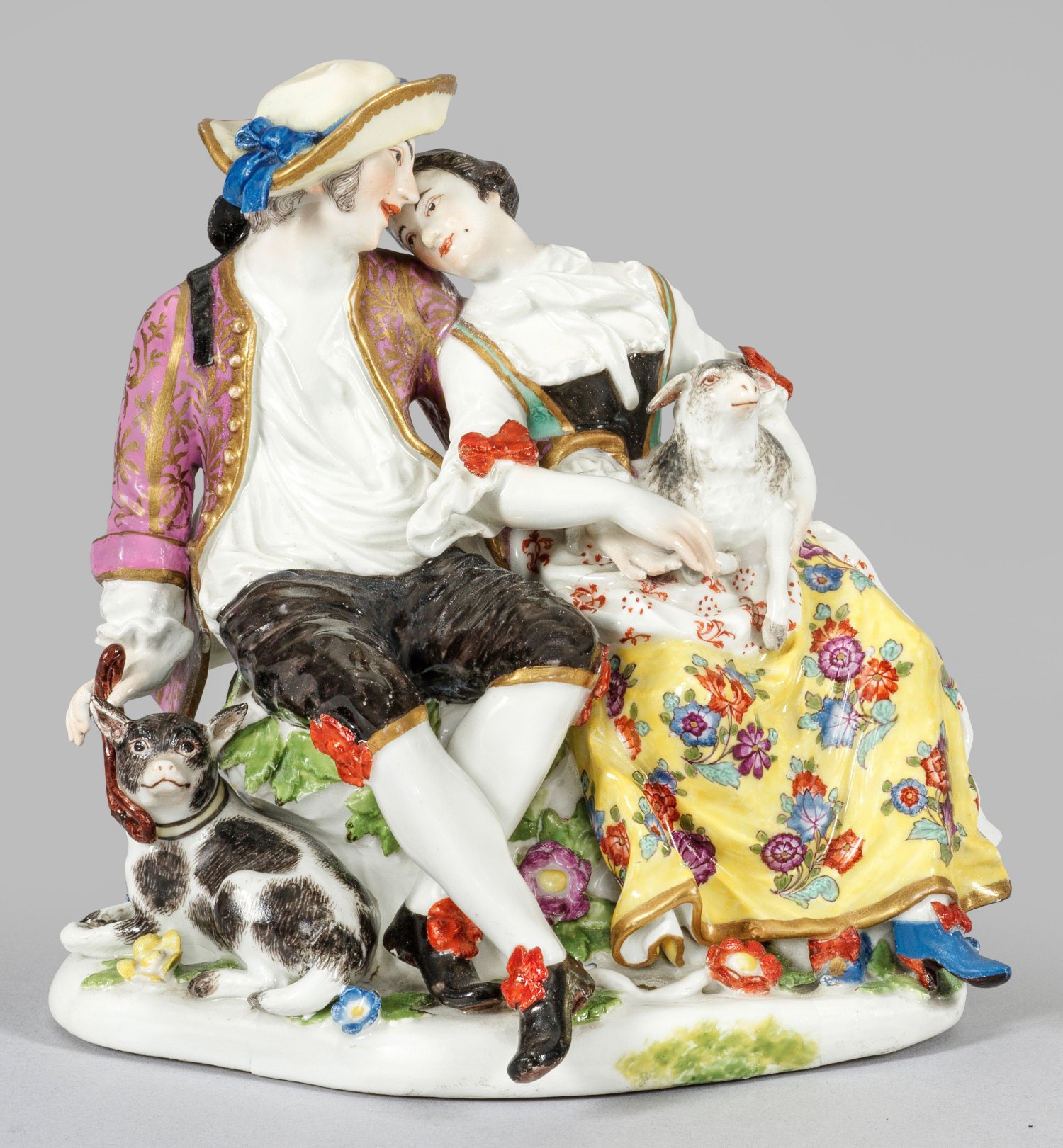 Auf ovalem, blütenbelegtem Sockel sitzende junge Schäferin mit kleinem Schaf auf ihrem Schoß. Ihren Kopf an die Schulter des ihr zugeneigten jungen Schäfers lehnend, der seinen vor ihm sitzenden Hund an der Leine hält. Polychrome Malerei mit Goldkonturierung. Entw. Johann Joachim Kaendler, um 1740. Minim. rest./unw. best.; Schwertermarke. H. 16 cm.