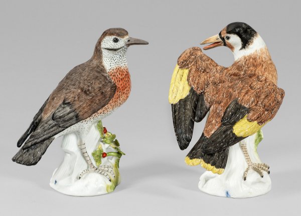 Auf einem teilw. mit plastisch aufgelegtem Blattwerk gestalteten Baumstumpf sitzender Star, sich den linken, geöffneten Flügel putzend bzw. eine Drossel. Äußerst feines reliefiertes Federkleid mit Staffierung in Brauntönen, teilw. Gelb und Schwarz sowie dunkel gestrichelte Gefiederzeichnung. Polychrome Malerei. Entw. Johann Joachim Kaendler, wohl um 1740 - 1745. Teilw. eingeritzte Modell-Nr. 974. Unw. rest.; Schwertermarke. Meissen. Mitte 18. Jh.; H. 15 cm - 15,5 cm.