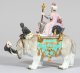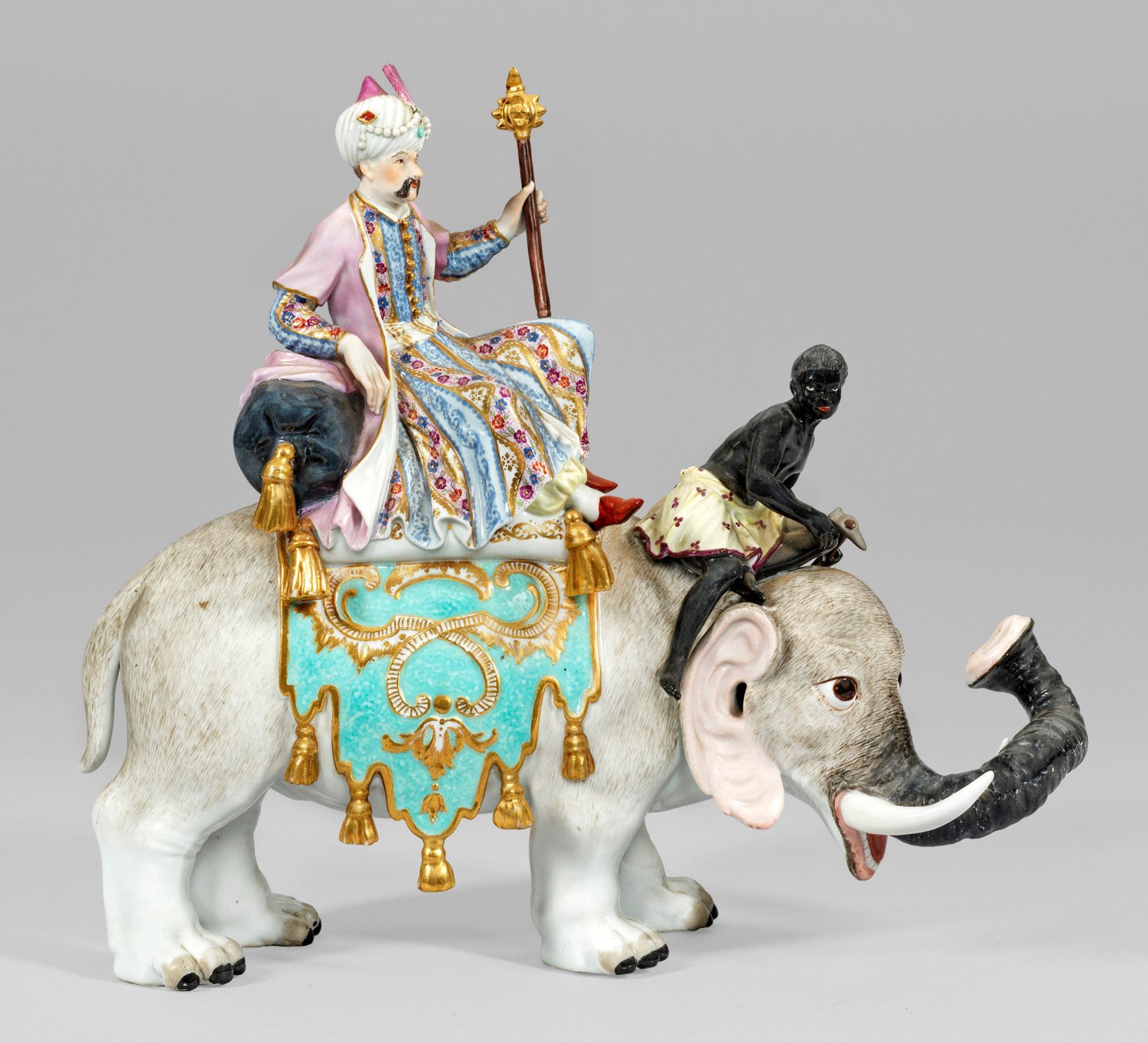 Naturalistisch hellgrau staffierte Elefantenfigur mit erhobenem Rüssel. Auf seinem Rücken, auf einem großen Polsterkissen mit Goldquasten sitzender Sultan in purpurnem Mantel über floral gemustertem Gewand sowie mit edelsteinbesetztem Turban. Im Nacken des Elefanten sitzender Mohr als Elefantenlenker. Polychrome Malerei mit reichem Golddekor. Entw. Johann Joachim Kaendler und Peter Reinicke, um 1749. Minim. rest.; Schwertermarke. 30 cm x 26 cm.