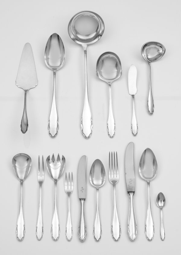 Silber. 66-tlg.; Speisemesser, -löffel, 3 -gabeln, 9 Menümesser, 5 -gabeln, 12 -löffel, 12 Kuchengabeln, 4 Teelöffel, 10 Mokkalöffel sowie 12 Vorlegeteile wie z. B. Suppenkelle, Salatbesteck, Saucenkelle, Kuchenheber und Vorlegelöffel. Konisches, flaches und randprofiliertes Heft mit reliefiertem Blattdekor. Edelstahlklingen. Gest. 800, Herstellerzeichen. Gew. zus. ca. 2830 g (Gew. ohne gefüllte Teile. ca. 2360 g).