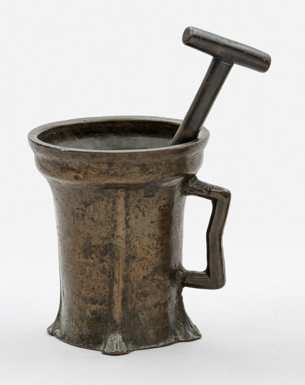 Bronze. Einhenkeliger Gefäßkörper, nach unten in leicht gespreizte Basis übergehend, oben in breites Lippenprofil ausschwingend. Drei durchgehende vertikale Verstärkungsrippen, in stilisierte, plastische Standtatzen auslaufend. Über der vierten Standtatze ein im Querschnitt achteckiger Henkel angesetzt. Pistill. H. 12,8 cm.