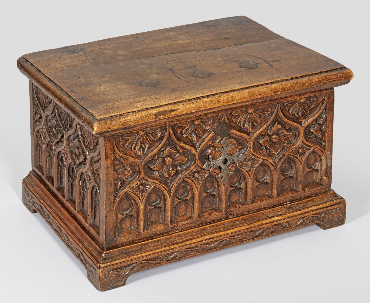 Nussbaum, teilw. reliefplastisch geschnitzt. Gerader, querrechteckig angelegter Korpus auf schmaler Profilzarge und rechteckigen Füßen. In der Front und auf den Seiten flächendeckender Dekor aus gotischem Maßwerk und Blütenrosetten. Gering überstehender Flachdeckel. Erg.; H. 28,5 cm. 51 cm x 35 cm.