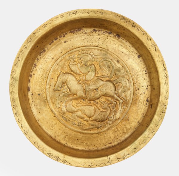 Messing. Gemuldete Schale mit schmalem, ausgestelltem Rand. Im Zentrum des leicht gewölbten Spiegels Darstellung des Hl. Georg als Drachentöter, umrahmt von Schriftband. Fahne verziert mit stilisiertem Blattdekor. Alters- und Gebrauchsspuren. H. 4,5 cm. D. 30,5 cm.
