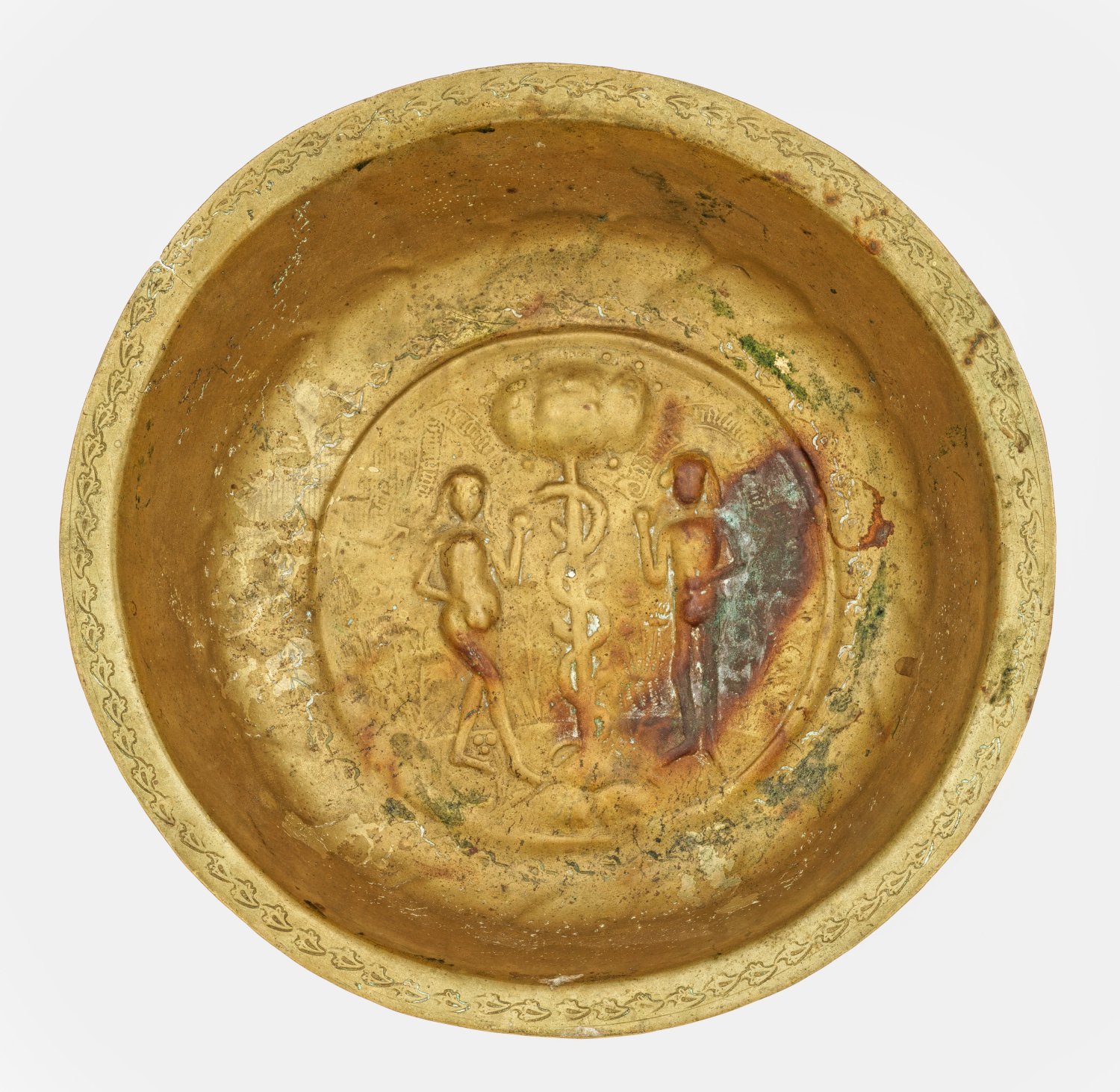 Messing. Tief gemuldete Schale mit schmalem, ausgestelltem Rand. Im Zentrum des leicht gewölbten Spiegels Darstellung des Sündenfalls. Adam und Eva unter flatternden Schriftbändern rechts und links die den Baum der Erkenntnis umschlängelnde, Eva zugeneigten Schlange. Fahne verziert mit stilisiertem Blattdekor. Minim. Alters- und Gebrauchsspuren, rest;. H. 7 cm. D. 28 cm.