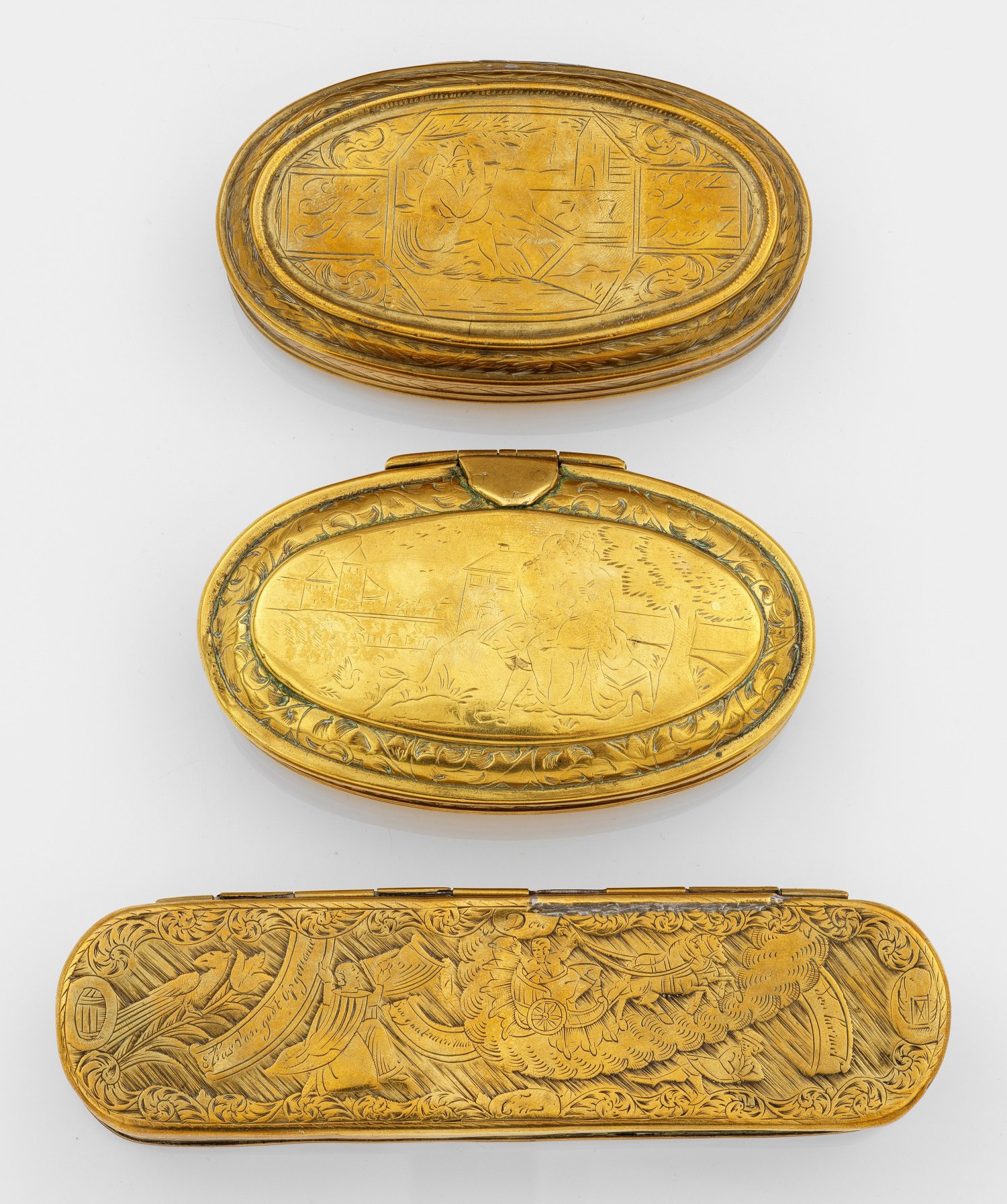 Messing, graviert. Ovale, teils langgezogene Grundform mit scharniertem Deckel. Auf Deckel und Boden elegante Pärchen, ein Mann, der einem Segelschiff zuprostet, Hirsche und zwei Szenen aus dem Leben des Propheten Elija, teilweise mit holländischen Inschriften. Rahmung und Rand umlaufend mit Blattranken und geometrischen Mustern. Ber., teilw. rest.; H. 4 cm. L. 13 cm - 18 cm. B. 5 cm - 8 cm.