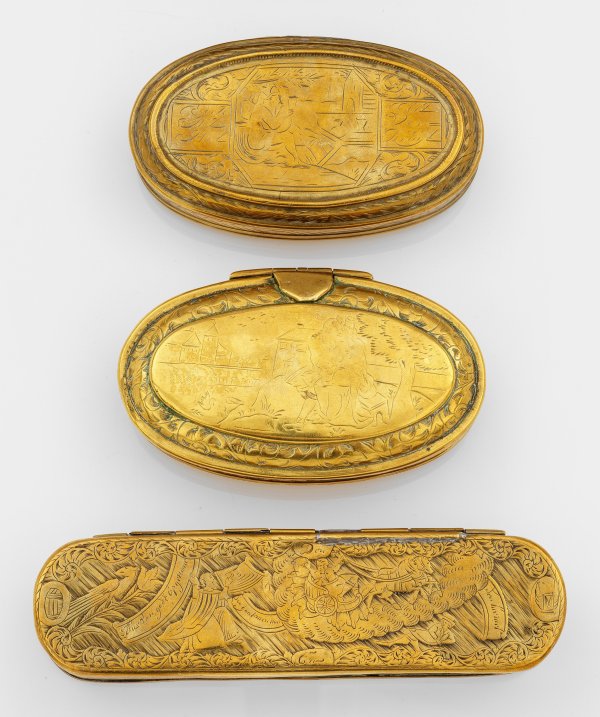Three Dutch brass snuff boxes. Rubbed, partly restored.