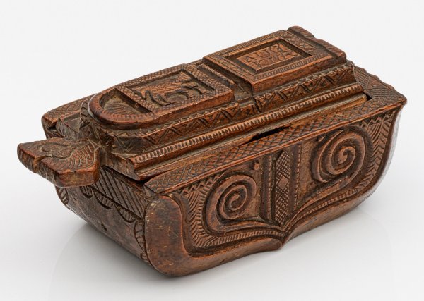 Nussholz, geschnitzt. Rechteckiger Korpus mit gerundet aufsteigender Standfläche. Schiebedeckel und frontale Längsseite mit geometrischen Ornamenten verziert. Auf dem Deckel die Darstellung eines stilisierten Pferdes, die Inschrift "AUQKNA" sowie auf der Handhabe ein Herz. Auf der Wandung dat. "1823". Rest.; H. 7,5 cm. 17,5 cm x 8 cm.
