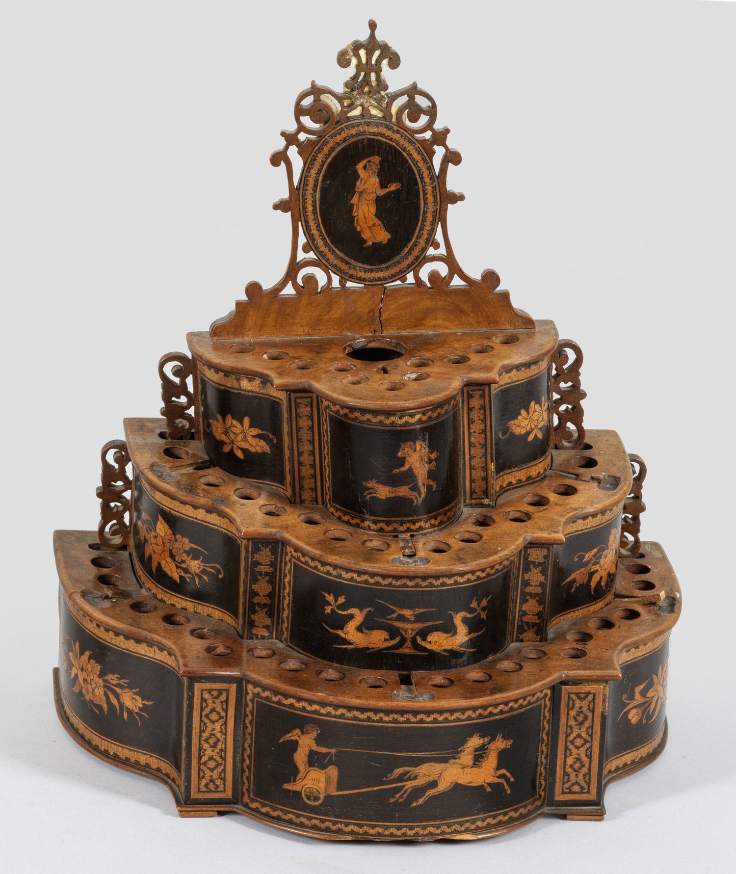 Nussbaum sowie feine Einlagen aus teilw. ebonisierten Hölzern. Bombierter Korpus aus drei gestuft ansteigenden und versenkbaren Elementen mit Aussparungen für Zigarren sowie Medaillonbekrönung. Schauseitig Reserven mit intarsierten Putti und Blüten. Besch.; H. 41 cm. 34 cm x 20 cm.