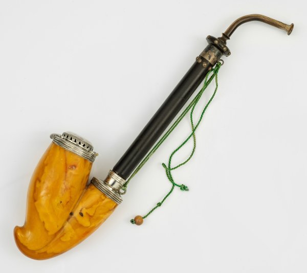 Bernstein, Holz und Horn mit Silbermontierung. Gebogter Pfeifenkopfkörper mit scharniertem Deckel. Korpus aus geschliffenem Butterscotch-Bernstein. Mundstück aus Horn. Montierung unterhalb gest. 13 Lot, teilw. undeutl. Beschauzeichen, Steuermarke, Meister "I B" (?). Minim. best.; L. 27 cm.