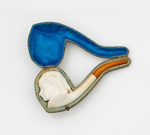 im Etui. Meerschaum geschnitzt. Figural gearbeiteter Pfeifenkopf in Form eines Frauenkopfes mit kunstvoll hochgestecktem Haar und Hut. Gebogtes Mundstück aus Bernstein. L. 18 cm.