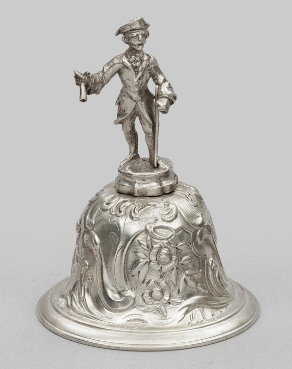 A German silver table bell with rocaille decor and a handle in shape of a man with a tricorn hat, a walking stick and a horn.