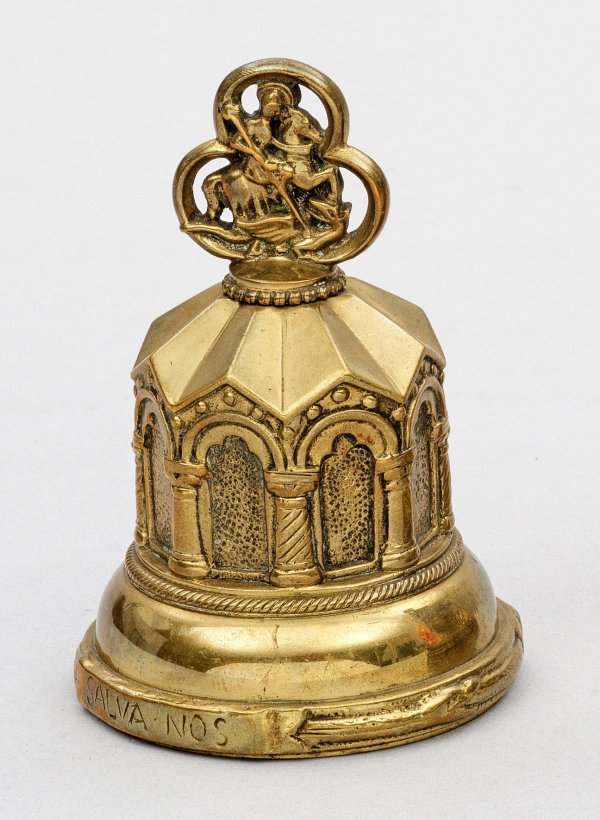 Messing. Glocke mit Wandungsrelief in Form eines umlaufenden Kreuzganges. Dreipassig gerunderter Griff mit durchbrochen gearbeiteter, halbplastischer Darstellung des Hl. Georgs im Kampf mit dem Drachen. Auf ausgestelltem Standring umlaufend zwei einander in den Schwanz beißende Schlangen, sowie Spruchbänder mit den Inschriften "St. Georgius" und "Salva nos". H. 10 cm.