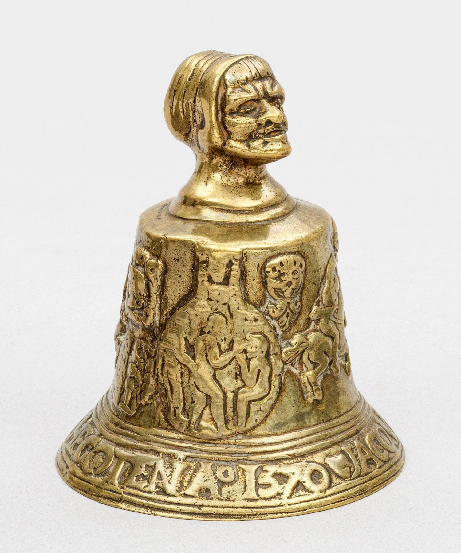 Messing. Glocke mit dem Kopf einer grimmigen alten Dame mit Kopftuch als Griff. Wandung mit Darstellung kämpfender Reiter und teilw. gerahmter Köpfe. Unterhalb Inschrift "Jacoubs Serke heft my goten a° 1370".; H. 10 cm.
