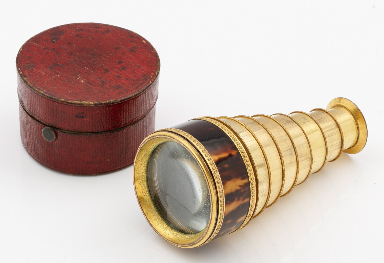 Originales Etui mit grünem Samt ausgekleidet. Vergoldetes Messing und Schildpatt. Siebenfacher Auszug. Schildpatt besch.; Linsen-D. 4 cm. L. 10 cm.
