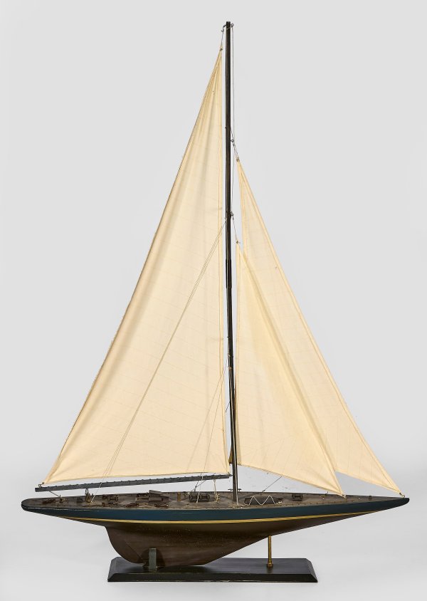 Holz, dunkelgrau und braun gefasst sowie naturfarbener Baumwollstoff. Über flachem, gekanteten Sockel klassischer Einmaster mit gestrecktem Rumpf, Kajüteneingang an Deck, vertautem Rettungsboot und gespannten Segeln. H. 155 cm. 113 cm x 19 cm.