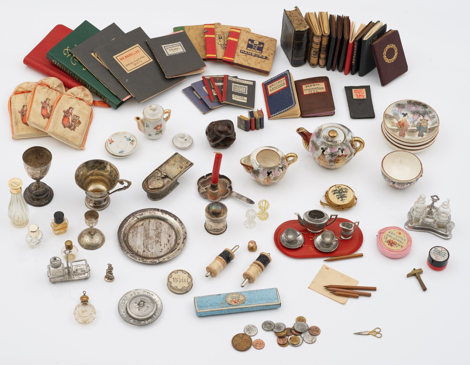 Unterschiedliche Materialien wie Glas, Zinn, Silber und Papier. Darunter 4-tlg. Teeservice, 3-tlg. Menage, Gläser, Miniatur-Parfümflakons, Geschirrteile und Miniaturkalender. Dazu kleine Garnrollen und Lavendel in Wäschesäcken. Menage-H. 4,5 cm.