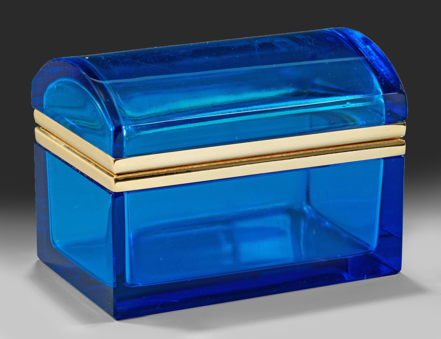 A chest-shaped French Art Deco cut and polished dark blue (or Persian blue) glass box with brass-mounted hinged cover.