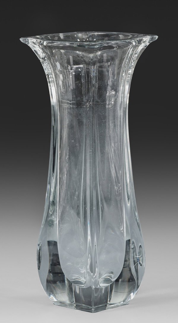 Farbloses Kristallglas, geschliffen und poliert. Balusterform mit rautenförmigem Querschnitt und an den Ecken gerippter Wandung. Runder Firmen-Ätzstempel "CRISTAL SEVRES FRANCE". H. 34,5 cm.