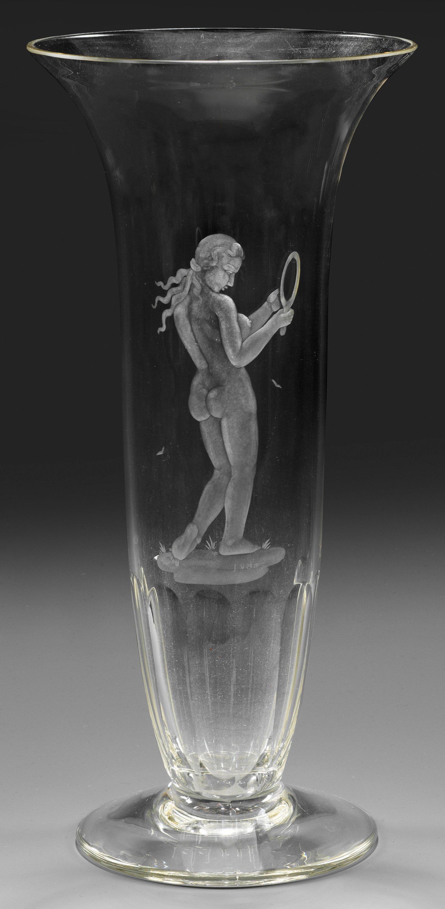 Hohe Glockenform auf Scheibenfuß. Farbloses Glas, unterhalb facettiert. Schauseitig geschnittener Dekor eines stehenden Aktes, sich im Spiegel betrachtend. Sign. "Jvde". H. 29,6 cm.