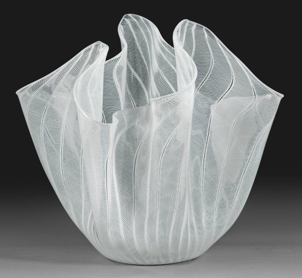 Auf rundem Stand hochgezogene, in der Art eines Taschentuchs gefaltete Wandung. Farbloses Glas mit sehr feinem, weißem "Zanfirico"-Fadennetzdekor. Entw. Fulvio Bianconi, um 1948/50. Dreizeiliger Firmenätzstempel "venini murano ITALIA". H. 27,5 cm.