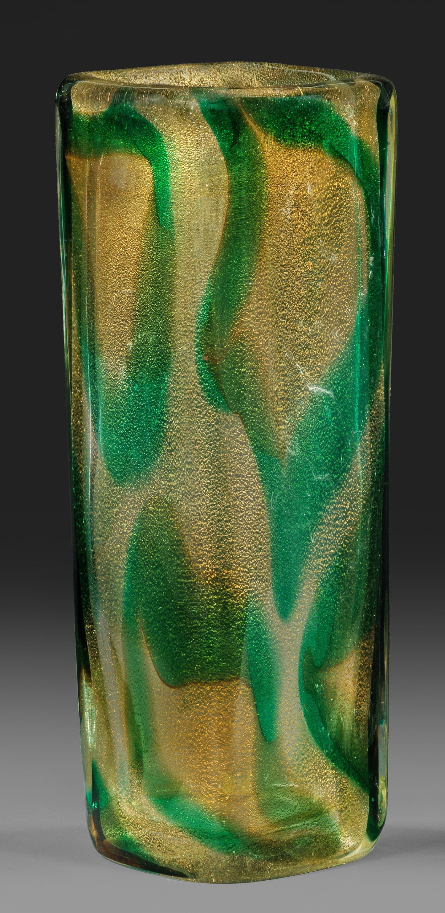 Hohe Becherform mit quadratischem Querschnitt. Dickwandiges Überfangglas mit orangebraunen, grün umrandeten Fleckeneinschmelzungen und fein zersprengter Goldfolie. Entw. Archimede Seguso 1952. H. 26 cm.