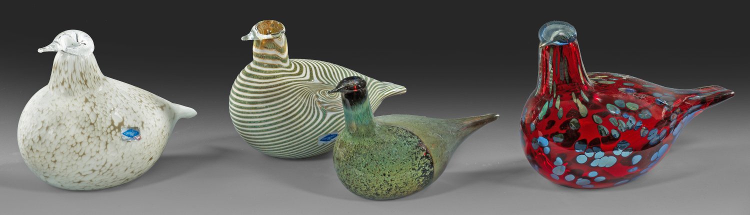 Stilisierte Vogelfiguren aus farblosem und farbigem Glas in verschiedenen Dekoren und Techniken, teilw. irisiert. Entw. Oiva Toikka, seit 1972. Jeweils gem. bzw. sign.; Drei Tauben mit Etikett der Glasfabrik Nuutajärvi (zwei davon auch mit gravierter bzw. geritzter Sign.), eine Taube mit Firmenetikett von Iitalla und Ätzstempel-Sign.; H. 9,5 cm-13,5 cm.