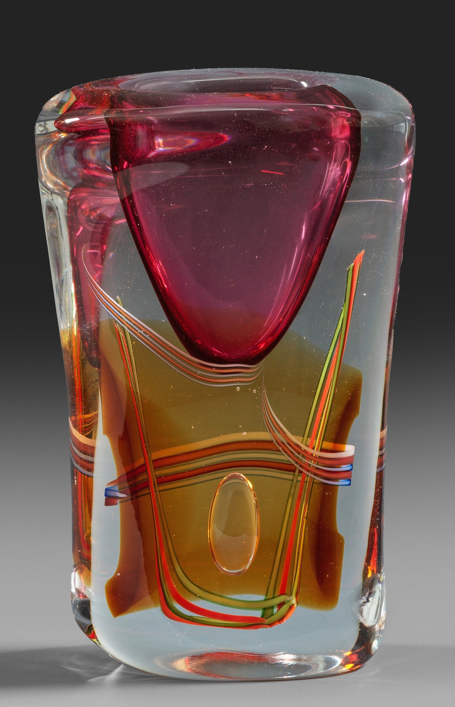 Dickwandige, gegen den Uhrzeigersinn verdrehte, hochrechteckige, beidseitig abgeplattete Form mit querovalem Querschnitt. Überfangglas, farblos, unterhalb eingeschmolzen ein großer bernsteinfarbener Fleck, eine Luftblase, hochgezogene, polychrome mehrere polychrome Fadenbänder, die vertiefte Vasenöffnung in spitzovoider Form aus himbeerrotem Glas. Sign.; H. 22,5 cm.