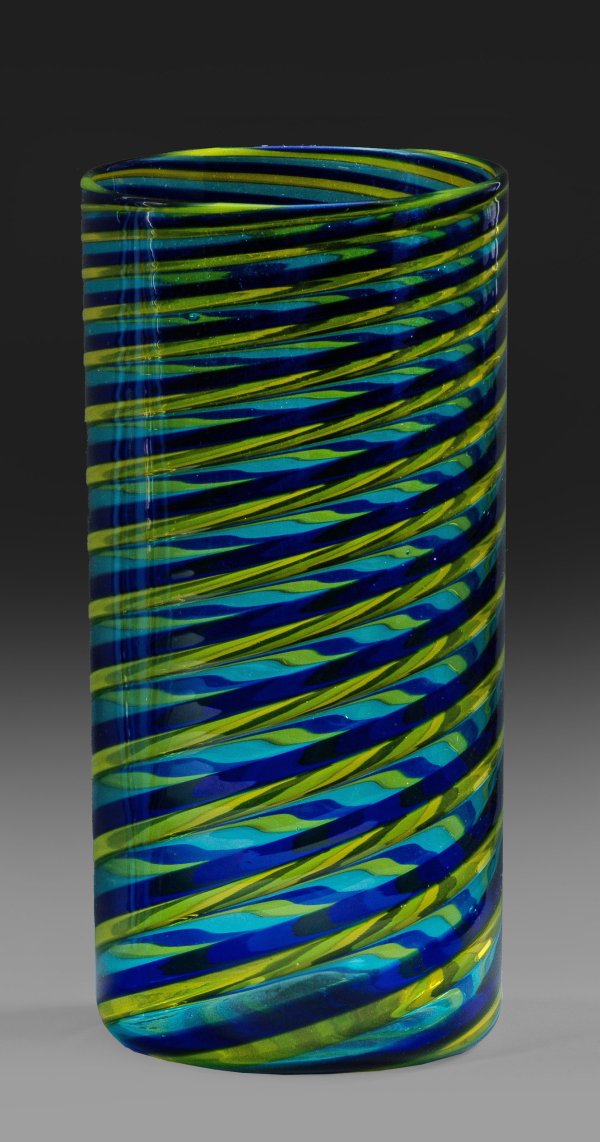 Zylindrisch. Dekor aus spiralförmig hochlaufenden Bändern aus gelbem, dunkelblauem und türkisblauem Glas. Sign. "Arnoldo Toso Murano". H. 19,3 cm.