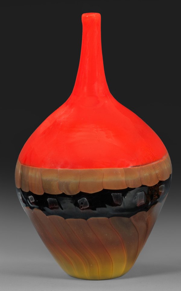 Organische, beidseitig ins Oval gedrückte, gebogte Kolbenform. Überfangglas, farblos, vertikale Band- und Fadeneinschmelzungen in Gelb, Brauntönen, Rot und Schwarz, schauseitig ein Band mit Dekor aus dunklen Tupfen. Sign.; H. 30,5 cm.