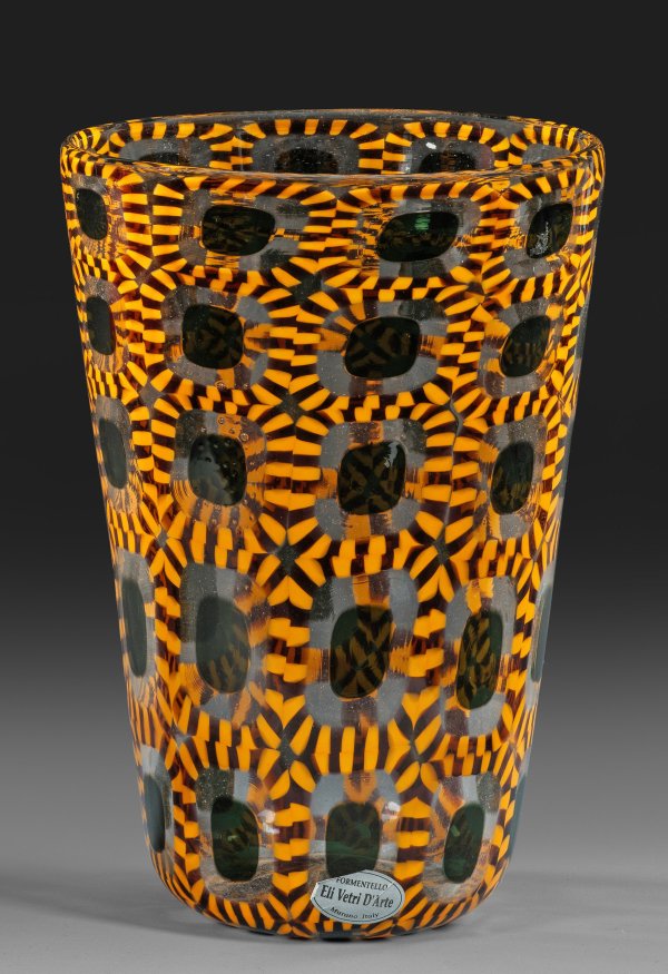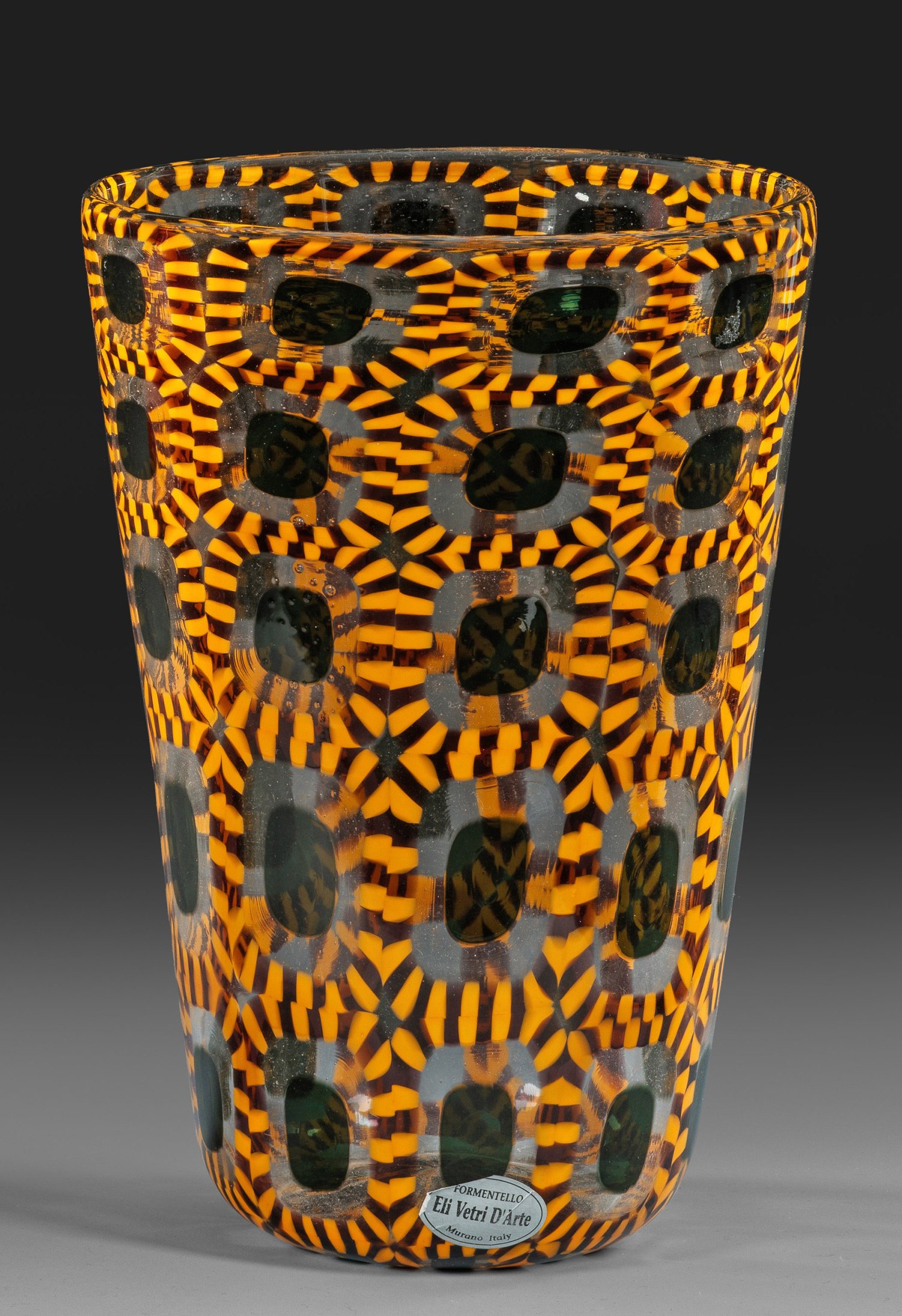 Leicht konische Form. Überfangglas, farblos, flächendeckender, geometrischer Dekor aus farblosen, dunkelgrünen, violetten und gelben Murrinen. Ritz-Sign. "Formentello - Murano" und Etikett von Formentello/Eli Vetri D'arte. H. 24,5 cm.