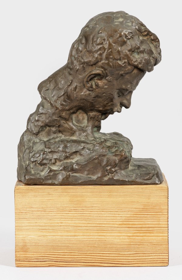Bronze, dunkelbraun patiniert, 1905. Späterer Holzsockel. Wvz. Sauer 44. Lebzeitguss (vor 1939); Sauer nennt sechs Original-Bronzegüsse. Bronzen Clara Rilke-Westhoffs gehören zu den Rarissima in öffentlichen und privaten Sammlungen und auf dem Kunstmarkt. Das ganz auf das markante Profil hin komponierte Porträt des lesenden Rilke mit stark geneigtem Kopf auf niedrigem, gestuftem Sockel entstand 1905, nachdem sich Clara und der unstete Dichter bereits weitgehend getrennt hatten. Es spiegelt die Persönlichkeit Rilkes und ihre eigene, persönliche widersprüchliche Beziehung zu ihm wider, in seiner lebhaften Modellierung auch den Einfluss Auguste Rodins. Clara Rilke-Westhoff blieb, obgleich sie eine der ersten, bedeutenden deutschen Bildhauerinnen der Moderne war, zeitlebens im Schatten zweier Persönlichkeiten - Rilke und Paula Modersohn-Becker (mit der sie eng befreundet war). Die Entstehung der Bronzeplastik ist gut dokumentiert: August 1905 weilte sie auf Einladung der Gräfin Luise von Schwerin für 14 Tage in Schloss Friedelhausen, wo sich auch schon Rilke aufhielt. Dort modellierte sie ihn in charakteristischer lesender Haltung, zurückgekehrt nach Worpswede erprobte sie unterschiedliche Kopfneigungen und Sockellösungen. Die vorliegende, letzte Version auf niedrig gestuftem Sockel ist die zweifellos überzeugendste Fassung und auch Clara Rilke-Westhoff selbst hielt diese für die gelungenste, sodass nur hiervon mehrere Bronze-Exemplare gegossen wurden. Rodin, dem sie im Herbst 1905 Fotografien hiervon sandte, beglückwünschte sie hierzu "Es gibt nicht viele Bildhauer, die das können" und lud sie zu sich nach Meudon bei Paris ein. Daraufhin konnte sie 1905 vier Wochen in einem der Ateliers Rodins arbeiten. H. 17,8 cm, B. ca. 15,5 cm. T. ca. 9,5 cm.