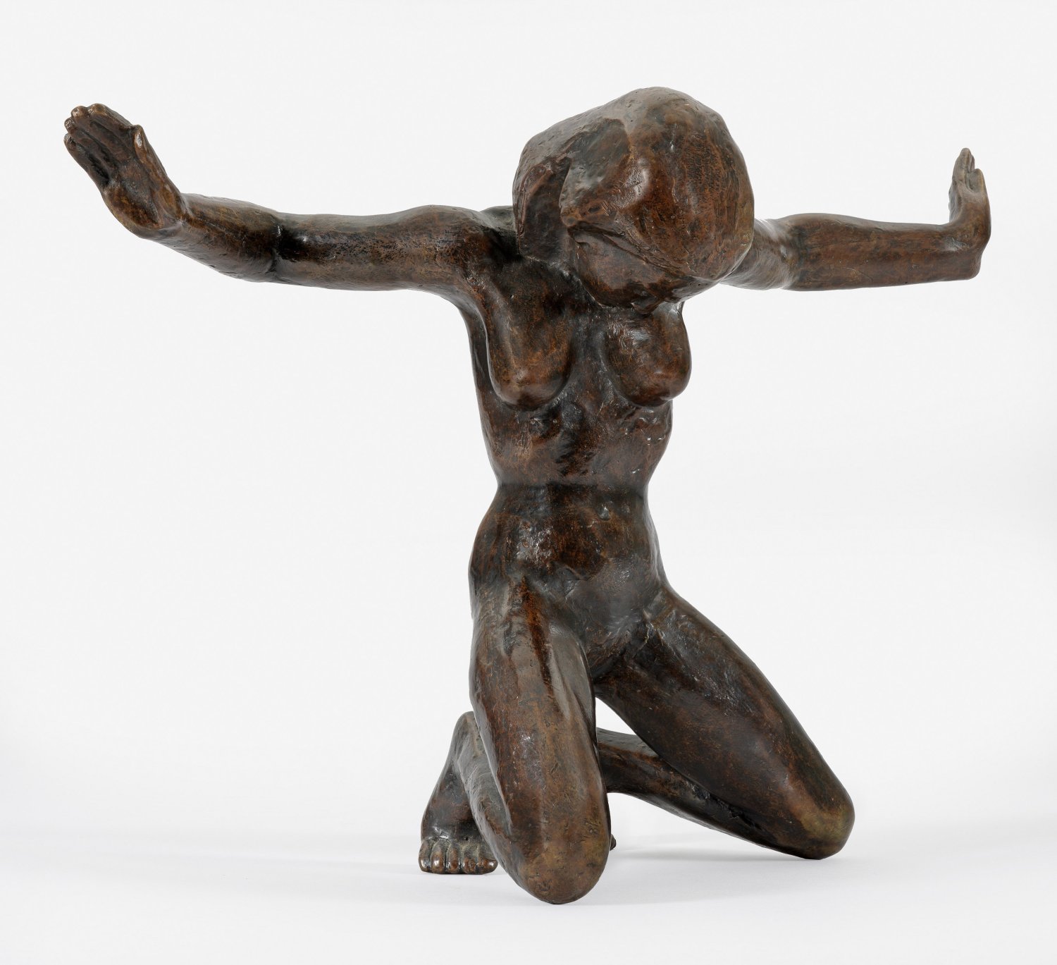 Bronze, braun patiniert, 1921/1978. Späterer, posthumer Guss von 1978, in einer Edition im Auftrag der Rockefeller-Familie, wohl nur in niedriger, einstelliger Auflage ausgeführt. Unter dem rechten Fuß monogr.; Kolbe, dem 1912 mit seiner später von der Nationalgalerie erworbenen "Tänzerin" in der Berliner Secession der künstlerische Durchbruch gelang, wurde 1919 als Mitglied in der Preußischen Akademie der Künste aufgenommen und wirkte 1919-1921 als Präsident der Freien Secession Berlin. Die vorliegende, ursprünglich 1921 von Kolbe geschaffene Aktfigur einer knienden jungen Frau mit weit ausgebreiteten Armen und gesenktem Kopf gehört zu den bedeutendsten und ausdrucksvollsten Plastiken aus dieser expressionistischen Periode im Oeuvre Kolbes. 1921/22 entstand nur eine kleine Auflage von 12 oder 13 Güssen (Exemplare befinden sich außer in der Nationalgalerie u. a. im Museum of Modern Art in New York). 1921 zeigte Kolbe die "Klage" erstmals in einer Einzelausstellung in der Galerie Paul Cassirer in Berlin, danach in vielen Ausstellungen, u. a. 1924 in der Akademie der Künste und 1931 im Museum of Modern Art in New York. H. 39 cm; B. 54 cm.