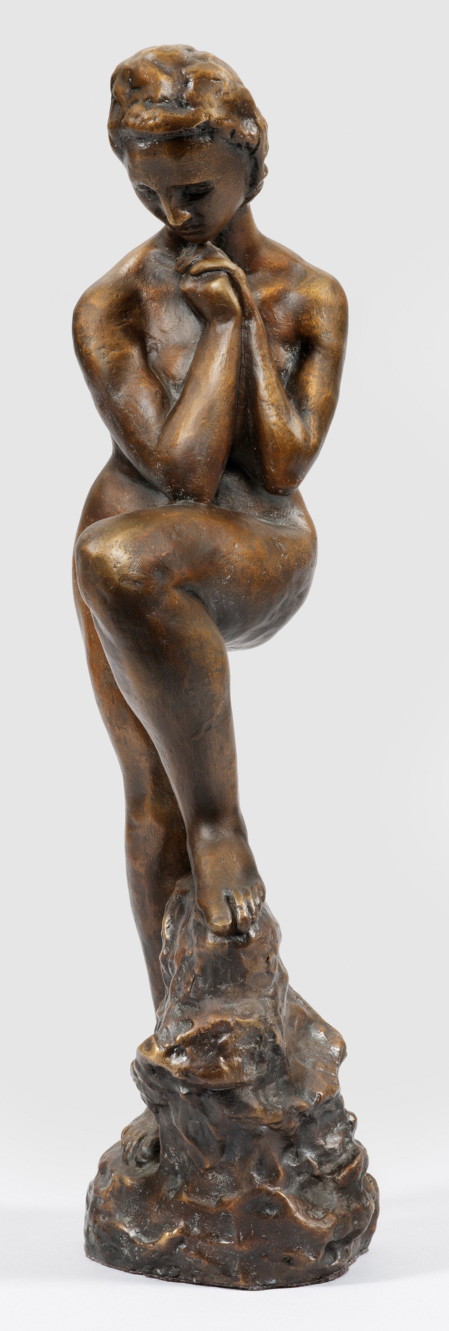 Bronze, dunkelbraun patiniert. Künstler-Bez. "W. LEHMBRUCK; Gießer-Inschrift "H. GONOT FONDEUR PARIS" (beides in Versalien). Posthumer, zeitgenössischer Guss (Ende 20./Anfang 21. Jh.) nach der 1910 von Lehmbruck in Paris geschaffenen Plastik, von der nur wenige Lebzeitgüsse bekannt sind. Lehmbruck griff mit dieser Aktfigur das schon in der Antike die Künstler faszinierende Motiv der Badenden auf und interpretierte es in moderner Weise durch eine in sich sehr geschlossene Formensprache und Komposition. H. 59,5 cm.