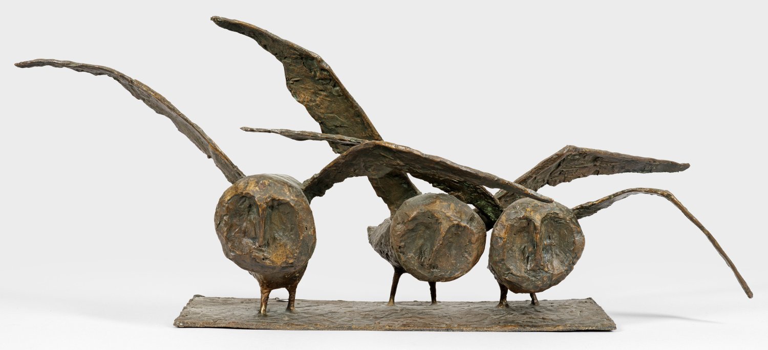 Bronze, dunkelbraun patiniert, 1951. Unter der Plinthe sign., dat. u. nummeriert "4 v. 6". In moderner Weise abstrahierte Tiergruppe des Bildhauers, der Schlotter, der nach seinem Studium in München seit 1951 in Darmstadt lebte und arbeitete, verlegte seinen thematischen Schaffensschwerpunkt auf die unterschiedlichsten Vögel. 1955 trat er in die "Neue Darmstädter Sezession" ein und war von 1967 bis 1970 ihr 1. Vorsitzender. Außer in Privatsammlungen sind seine Bronzen in vielen Museen und öffentlichen Standorten präsent, außer Werken in Darmstadt und Bonn auch durch den großen"Vogelbrunnen" vor dem Walsroder Vogelpark. H. 32 cm; B. ca. 76 cm; T. ca. 30 cm.
