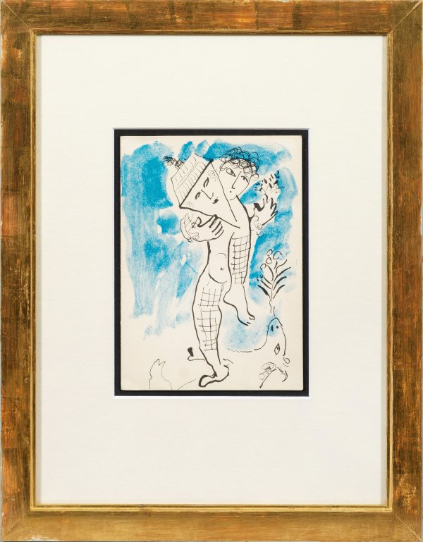 Farboffsetlithographie/Bütten, 1979. Einladungskarte zur Vernissage der Ausstellung "Marc Chagall peintures 1977-1979" am 10. Oktober 1979 in der Galerie Maeght in Paris. Doppelbogen, innen typografisch bez.; 21 cm x 15 cm bzw. 30 cm. Rahmen.