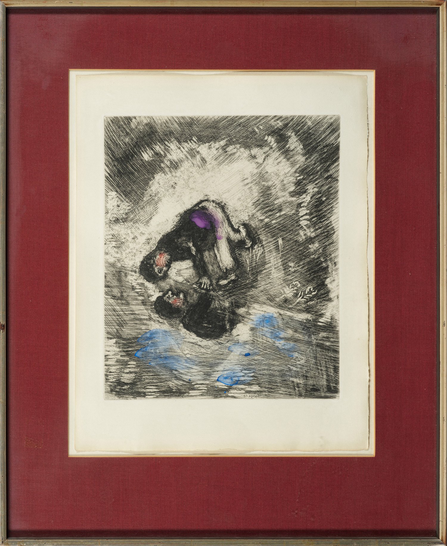 Radierung mit Handkolorierung in Hellblau, Violett und Rot/Papier, 1927-1930; gedruckt von Maurice Potin, Paris und erschienen im Verlag von Tériade Editeur, Paris, 1952. In der Platte sign.; Blatt Nr. 6 aus der Folge von 100 Radierungen "La Fontaine, Fables". Gesamtauflage 300 Exemplare. Prachtvoller, kontrastreicher Abzug mit schöner, seltener Handkolorierung, leicht eingeprägter Plattenkante und breitem Rand, an zwei Seiten mit dem Schöpfrand. Plattenmaß ca. 29,2 cm x 23,9 cm, Blatt 38,5 cm x 29,8 cm. Rahmen.