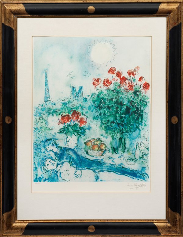 Farblithographie/Papier. Im Druck sign. (Faksimile-Signatur), nummeriert 225/400. Heiteres, farbenfreudig gestaltetes Blatt mit den typischen Chagall-Motiven mit dem Eiffel-Turm und Notre-Dame. Darstellung ca. 56 cm x 45,5 cm. Dekorativer Galerie-Rahmen.