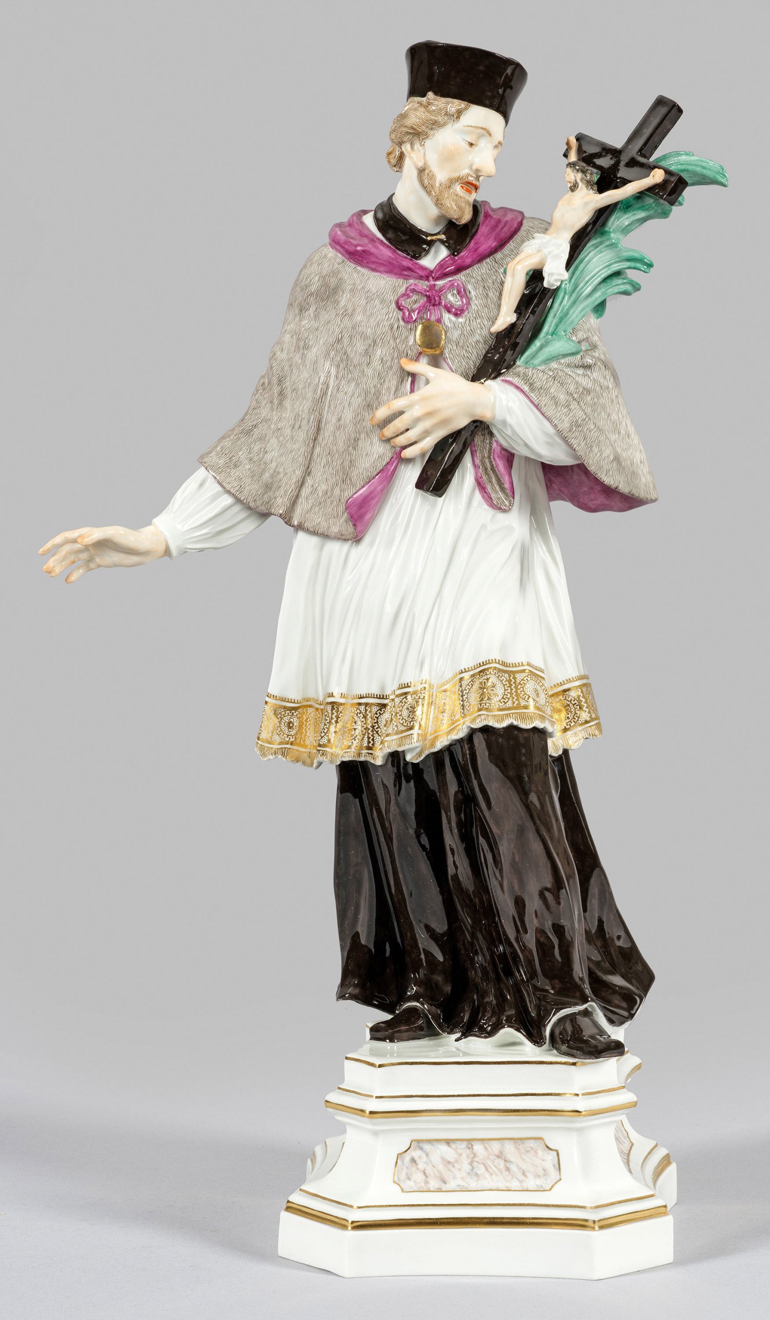 Auf passig geschweiftem, in Kartuschen marmoriertem Postament stehender Nepomuk in Soutane, in der linken Hand ein Kruzifix mit Palmzweig haltend. Polychrome Malerei mit Goldstaffage. Entw. Johann Joachim Kaendler. Modell-Nr. 337. Weißwaren- und Schwertermarke. H. 40 cm.