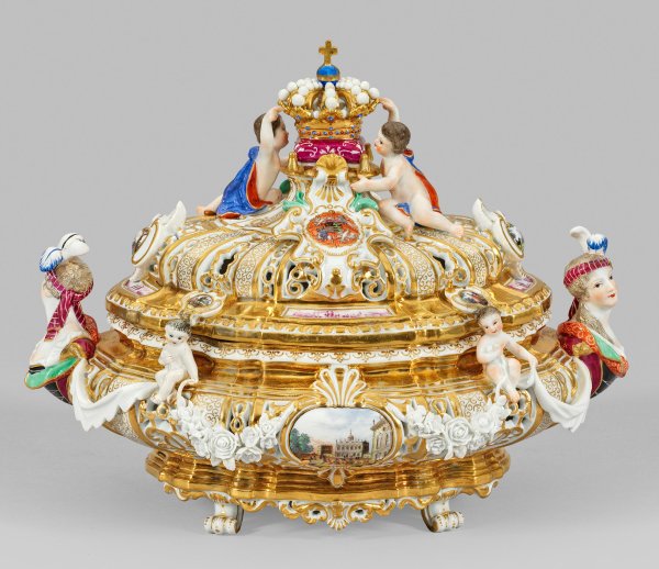 Ovaler, bombierter, doppelwandiger und ornamental durchbrochen gearbeiteter Korpus mit mehrfach verkröpfter Wandung. Seitlich Griffe in Gestalt einer plastischen Frauenbüste. Umlaufend kleine vollplastische Putten, verbunden durch aufgelegte Tuchgehänge sowie fein modellierte Blumenfestone. Beidseitig der Wandung muschelförmig bekrönte Kartuschen mit Kauffahrteiszenen. Korrespondierend gestalteter, stark profilierter Deckel. Als Bekrönung zwei liegende, die Königskrone haltende Putten. Umlaufend aufgelegte Kartuschenschilder mit dem kursächsischen Wappen, jagdlichen bzw. galanten Figurenszenen sowie purpurfarbener Kauffahrteidekor in schmalen, leicht vertieften, goldgerahmten Reservenfeldern. Deckelunterseite mit farbenprächtig staffiertem Blumenrelief. Innen vergoldet. Polychrome, teilw. purpurfarbene Camaieu-Malerei mit reichem Golddekor. Entw. Johann Joachim Kaendler. Modell-Nr. B 136. Minim. rest./best.; Schwertermarke. H. 20 cm.
