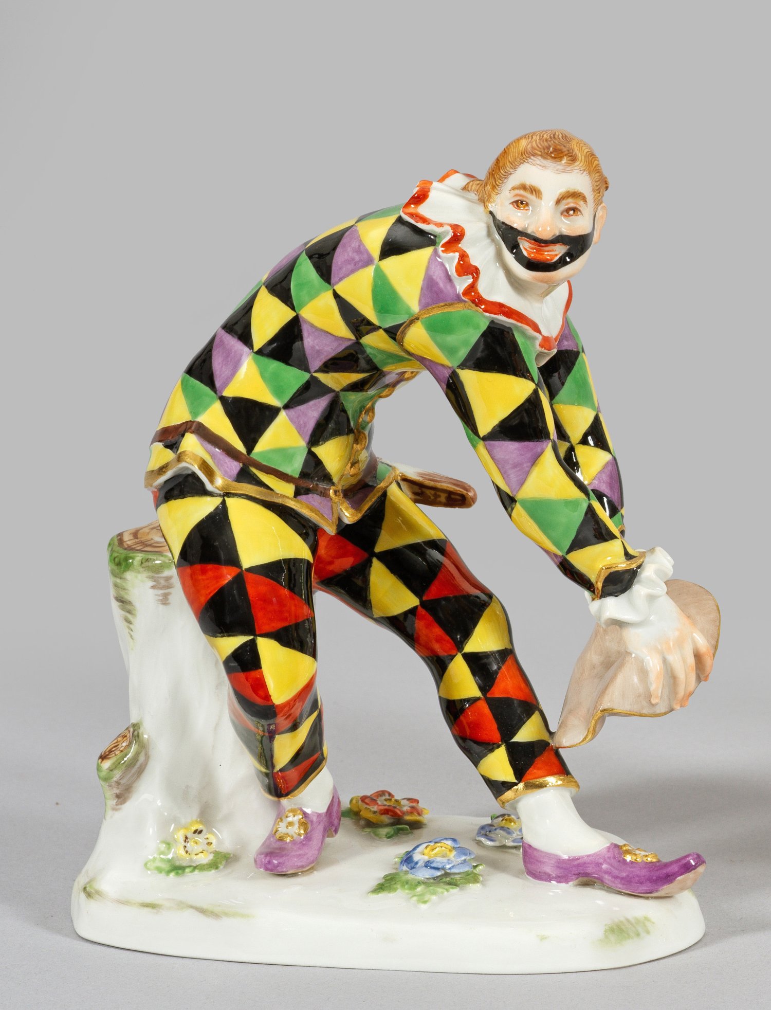 Auf unregelmäßigem, mit plastischen Blüten und Blättern belegtem Sockel, ein sich zum Gruß verneigender junger Komödiant in kariertem Kostüm mit Hut. Polychrome Malerei mit Goldstaffage. Entw. Johann Joachim Kaendler. Modell-Nr. 632. Schwertermarke. H. 17 cm.