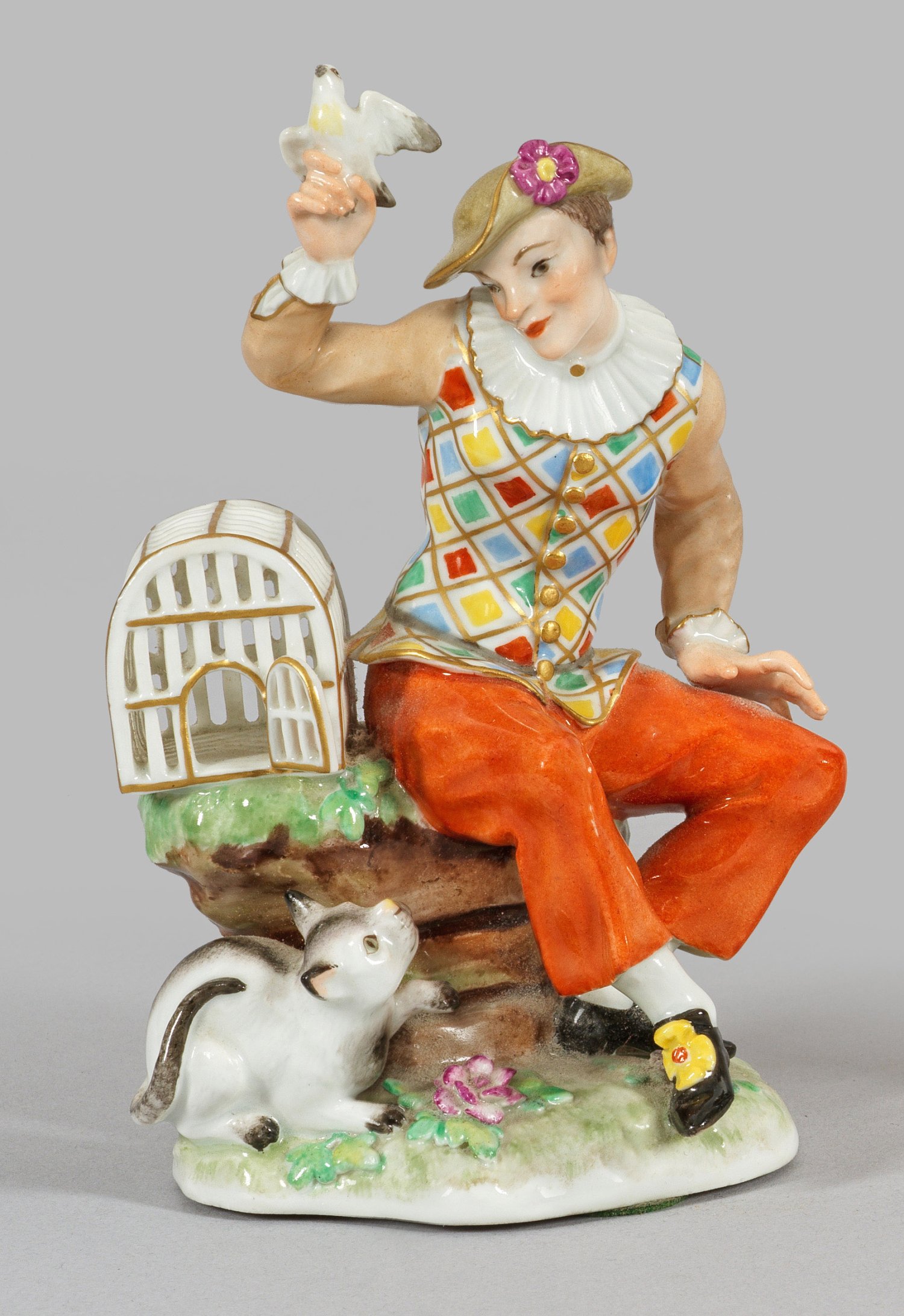 Auf einer Felsbank sitzender Harlekin, die Taube aus dem offenen Käfig emporhaltend. Zu seinen Füßen eine kleine Katze, sich nach der Taube reckend. Polychrome Malerei. Entw. Johann Friedrich Eberlein. Modell-Nr. 456. Schwertermarke. H. 14 cm.